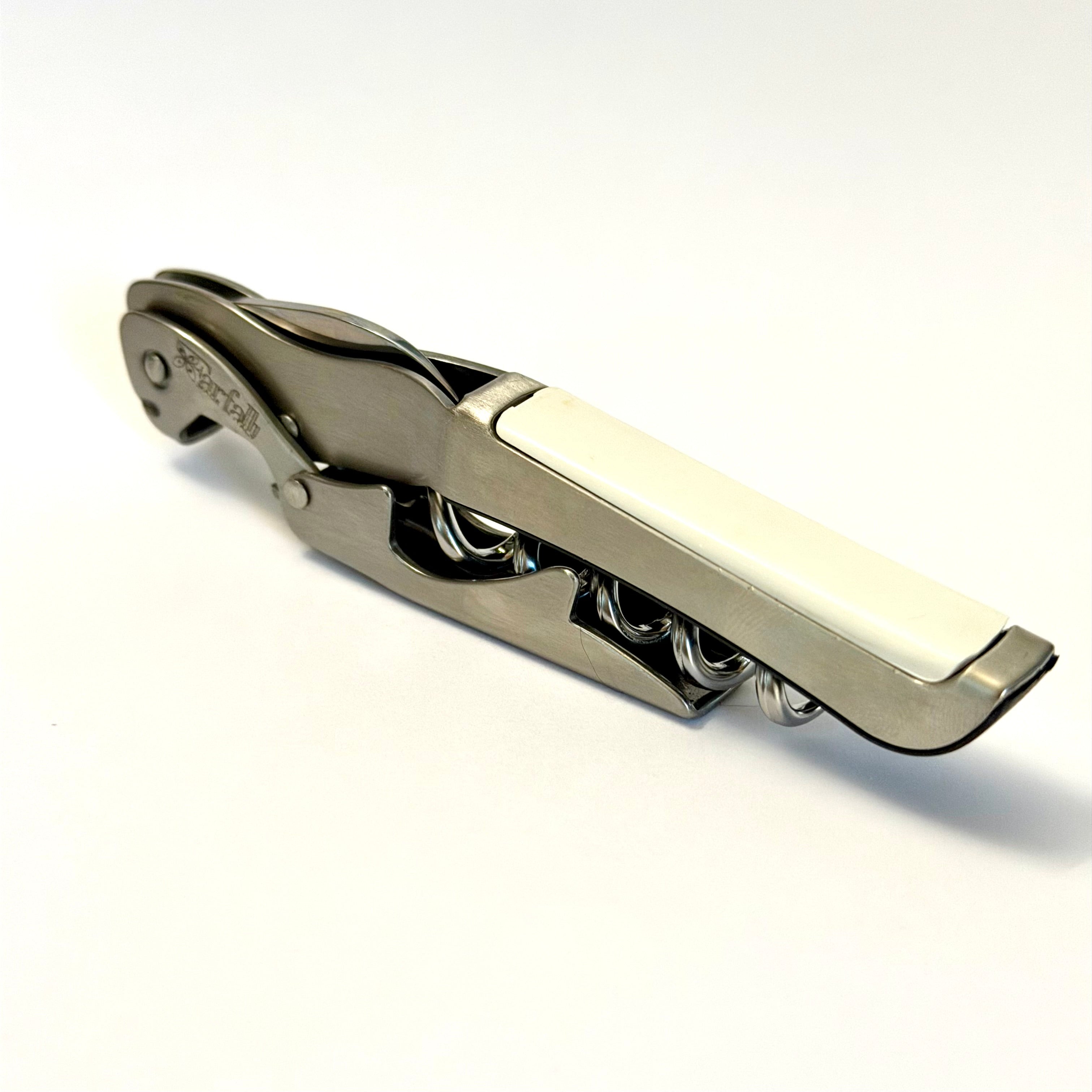 This two-step Farfalli Gulliver Double-Step Stainless Steel Waiter's Corkscrew with ABS Handle Insert (available in Black, White or Burgundy). The long handle gives it a solid feel in the waiter's hand while ensuring a safe, stable grip. A built-in serrated blade knife effortlessly cuts through foil, while a nickel plated open spiral worm is designed to cut into the cork more quickly for rapid service of your most popular wines. Plus, the spiral boasts a non-stick coating for easy extraction. This corkscrew's boot lever opens bottles with ease.