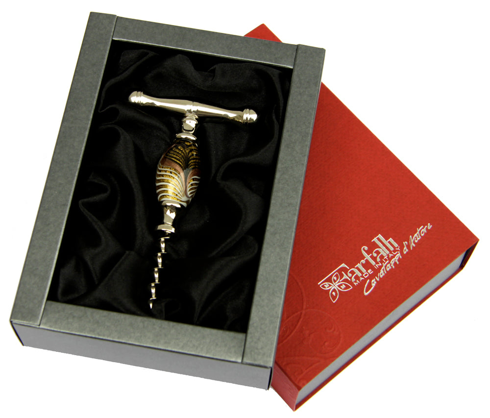 The Doge corkscrew is a handmade corkscrew with steel helicoidal spiral. The corkscrew is embellished with a hand blown glass pearl created by the finest glass-makers of Murano – Venice, Italy.
