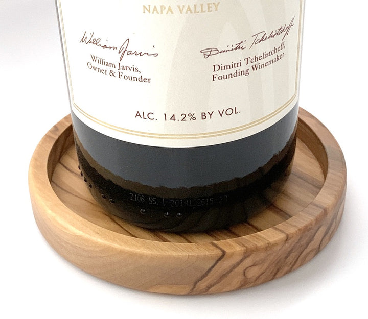 A beautifully crafted olive wood bottle coaster for wine and oil bottles, glasses, coffee and tea mugs, or for serving olives and antipasti. With a diameter of 3.2 inches, these coasters accommodate standard wine bottles, preventing red marks from dripping wine on your dinner table. Elevate your dining experience with our handcrafted olive wood coaster, a perfect gift for any occasion.