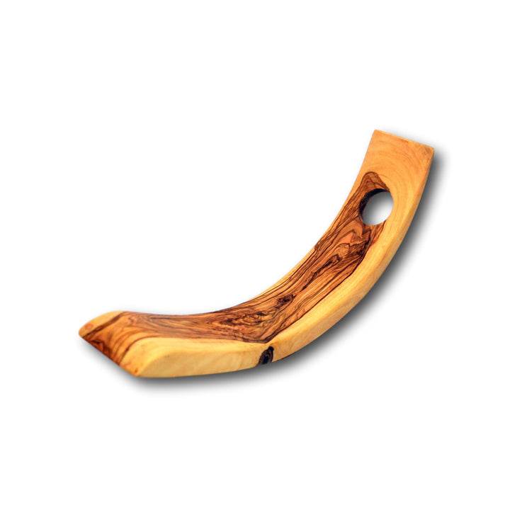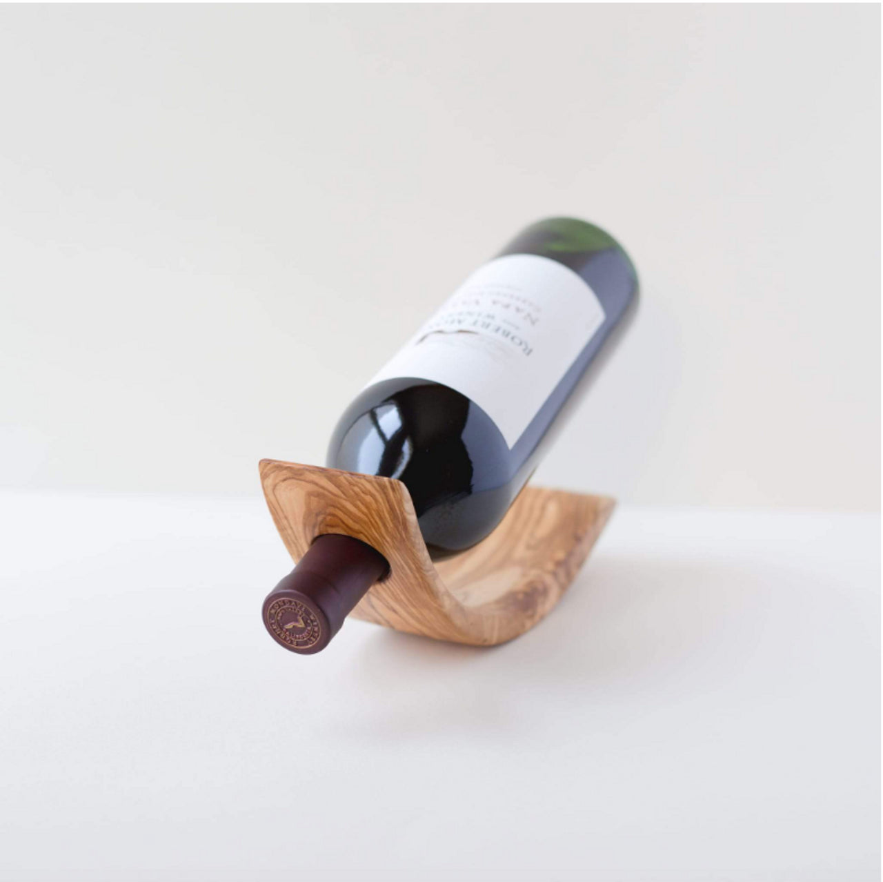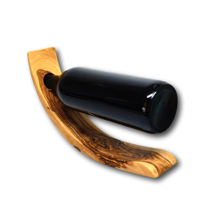 Sleek, modern lines meet the organic nature of natural olive wood in this striking wine bottle holder, perfect for displaying a bottle of your favorite vintage. Made from 100% sustainable olive wood. Food grade and anti-microbial. Each one is truly unique as nature intended. Hand crafted in the USA.