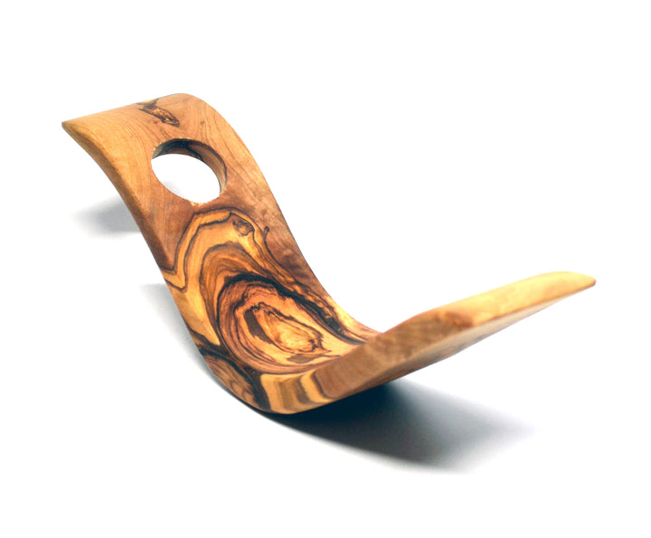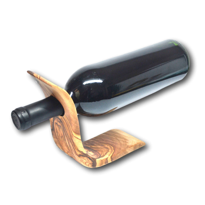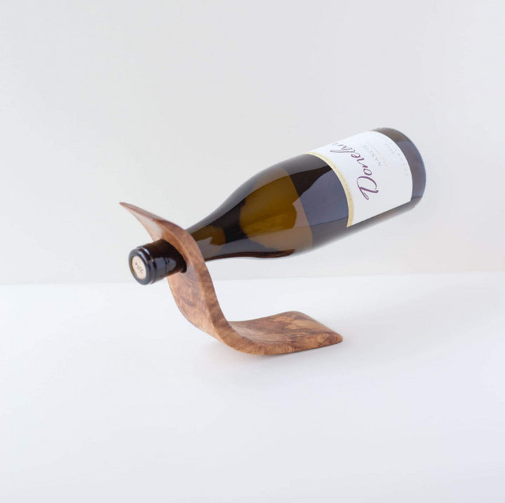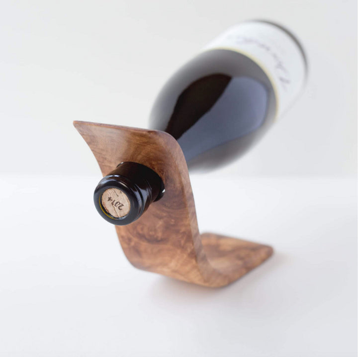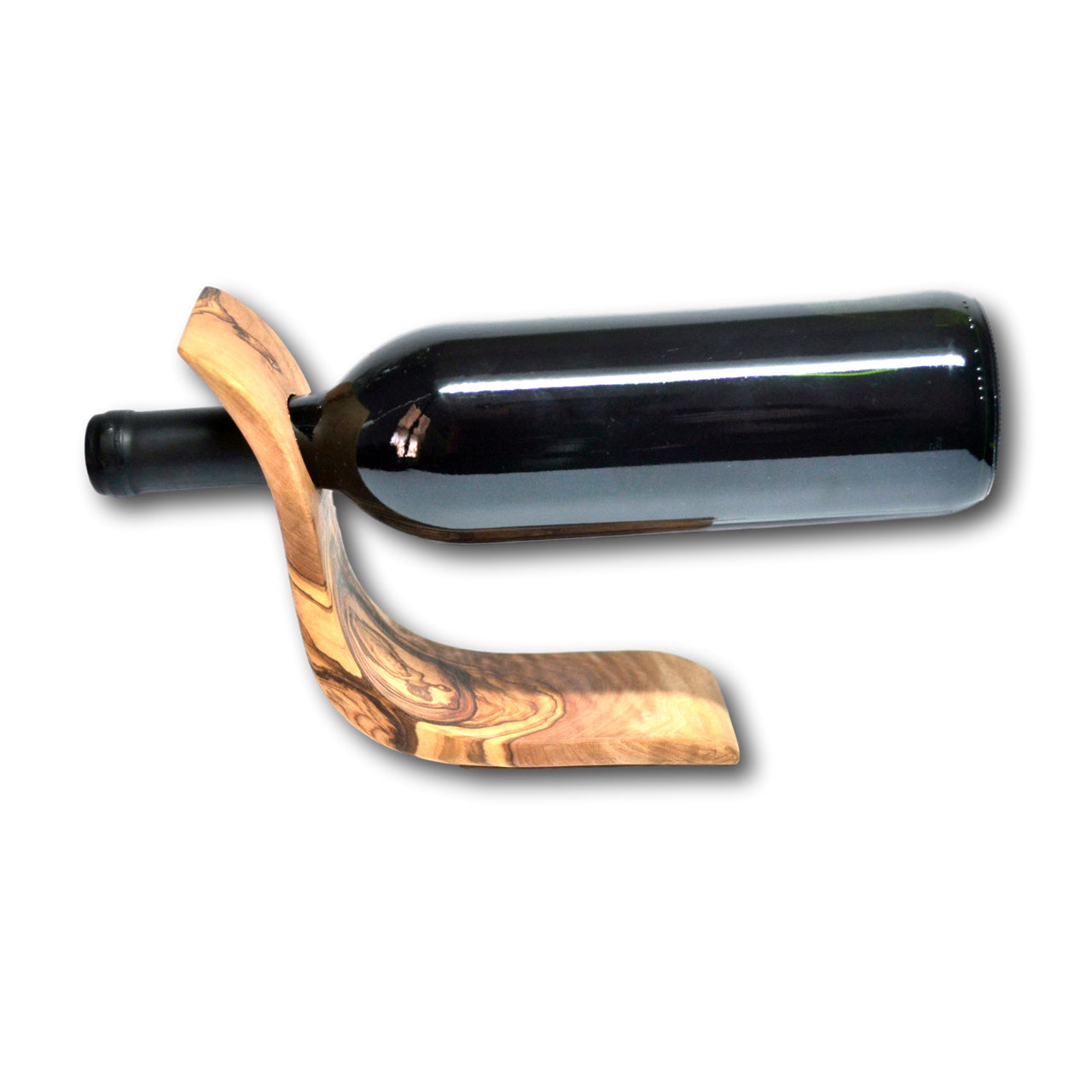 Sleek, modern lines meet the organic nature of natural olive wood in this striking wine bottle holder, perfect for displaying a bottle of your favorite vintage. Made from 100% sustainable olive wood. Food grade and anti-microbial. Each one is truly unique as nature intended. Hand crafted in the USA.