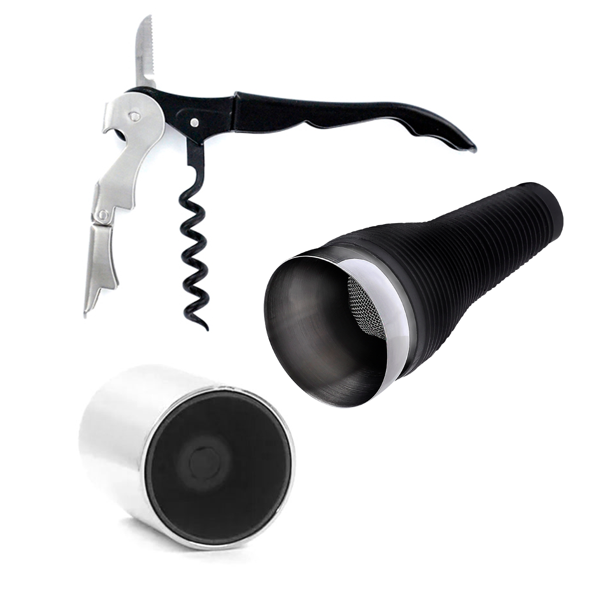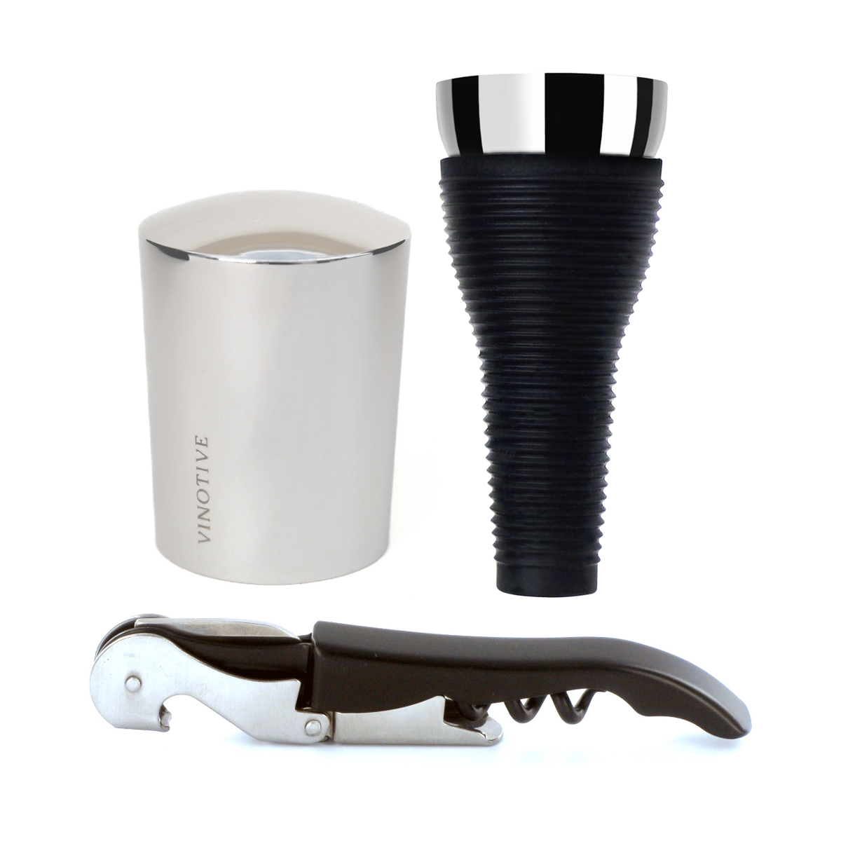 Vinaer Classic 3 piece Bundle - includes a Vinaer Classic 5-1 Wine Aerator, Modern Cast Metal Wine Bottle Stopper & a Black and Stainless Steel Vinpull Waiters Style corkscrew.