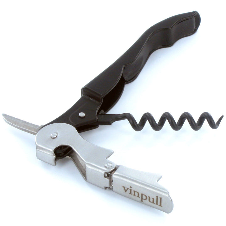 Vinpull Corkscrew - Uncorking is effortless thanks to the tried and tested double-hinged design and non-stick worm of the Vinpull waiters style corkscrew. Made of stainless steel, complete with an integrated bottle opener, serrated foil cutter and non-stick coated five turn spiral.