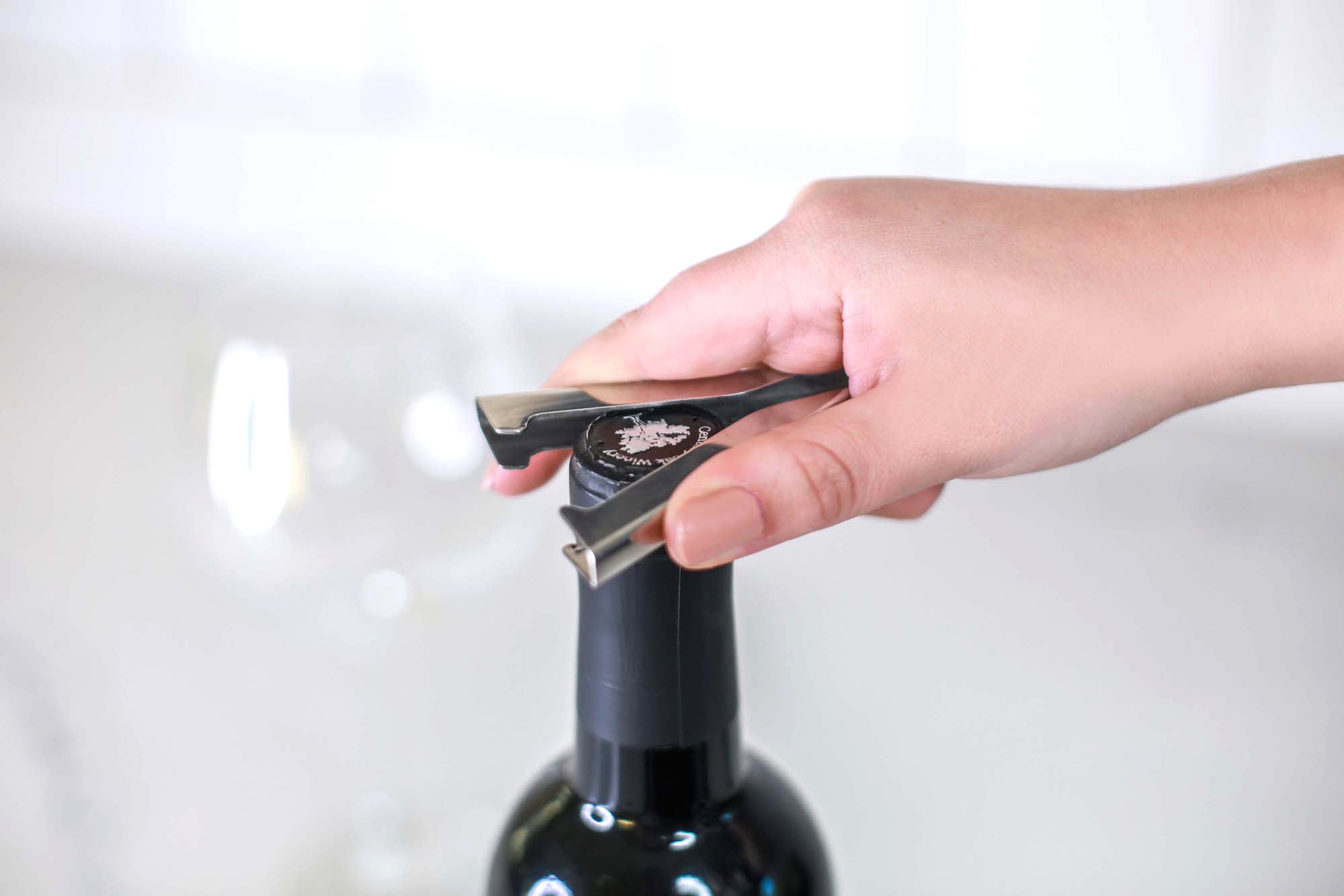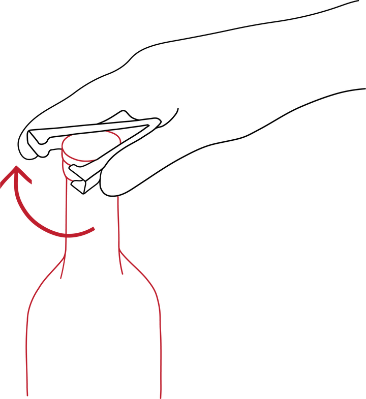 Simply place the V shaped foil cutter over the neck of the bottle, squeeze the sides then rotate the tool 360°.