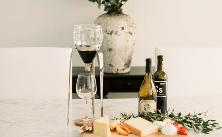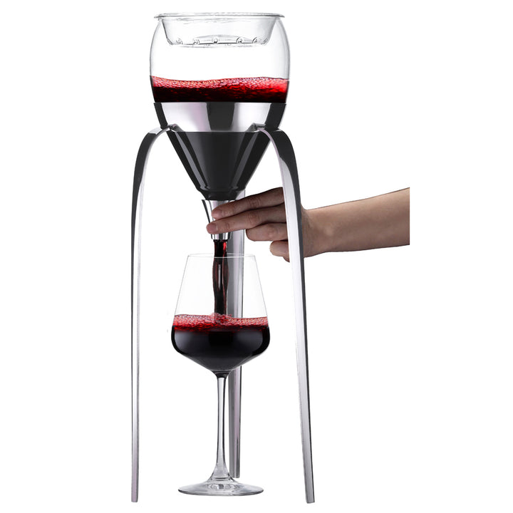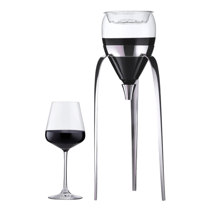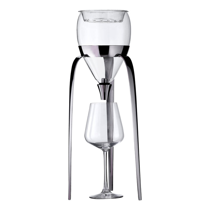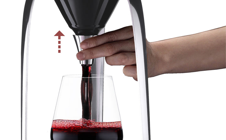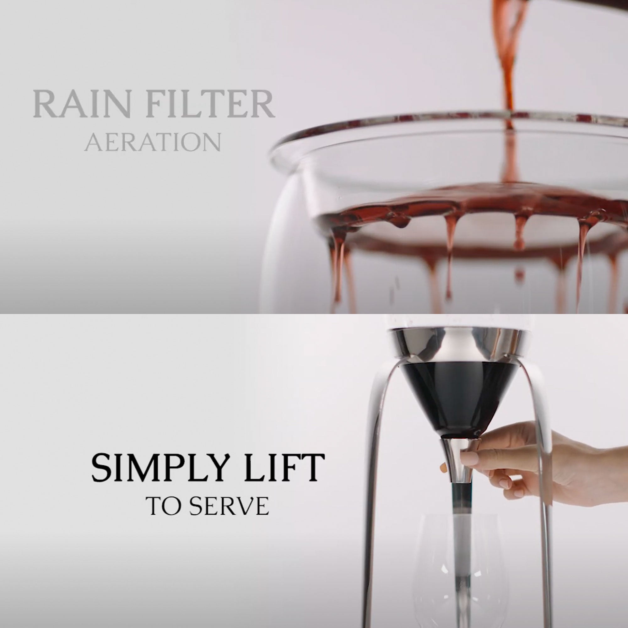 The VORTEX Somm is filled by allowing wine to pass through the "rain filter" which aerates the wine releasing the bouquet on it's way into the decanting vessel beneath, simply slide up the specially designed stainless steel gravity fed valve, and a glass of wine is served within seconds. Your guests can simply help themselves.